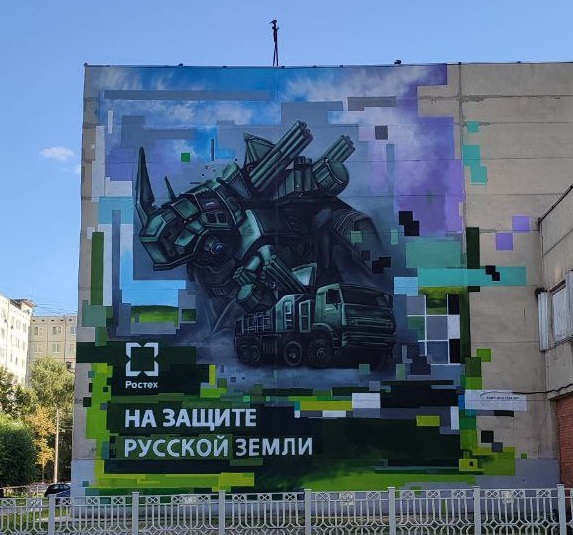 В Туле на Красноармейском, 17 появился мурал, в центре которого одна из самых известных разработок оружейной столицы России — комплекс ПВО «Панцирь-С1», выполненный в стиле глитч-сюрреализма.